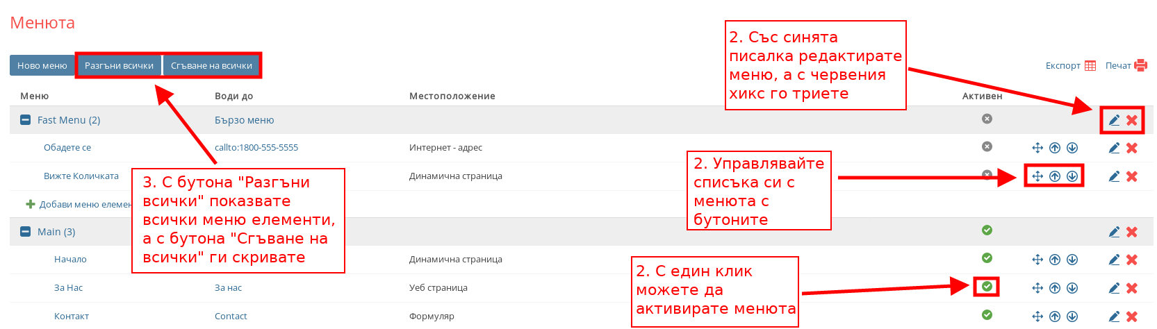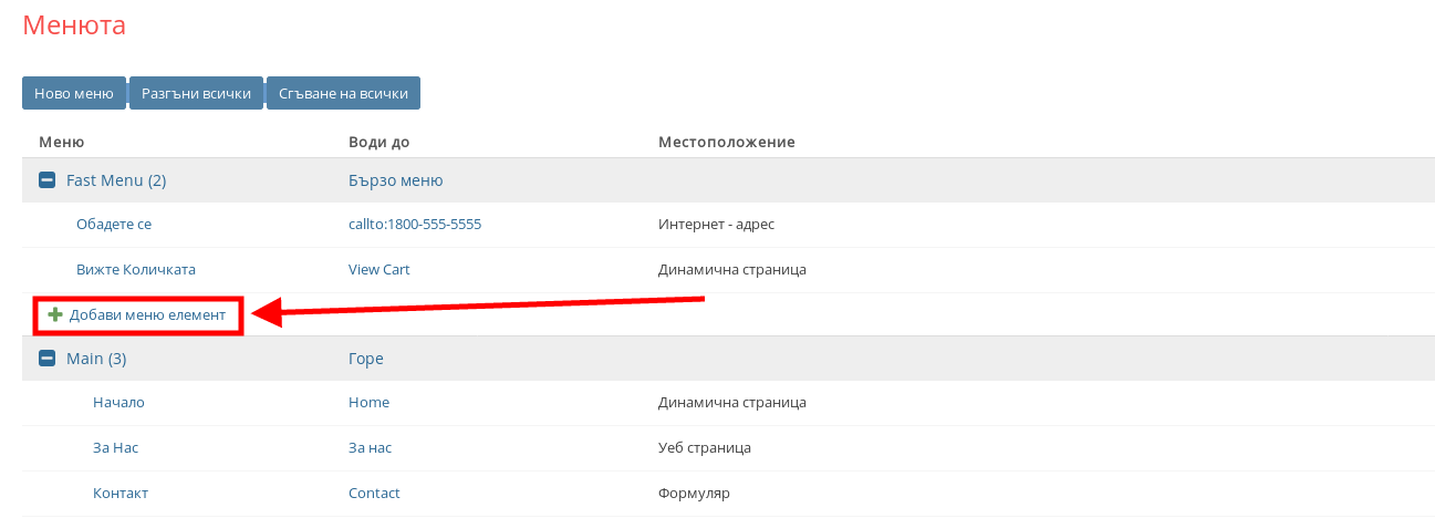 - С бутоните “Разгъни всички” и “Сгъване на всички” можете с един бутон да разгънете всички меню елементи на менютата или да сгънете всички меню елементи на менютата.