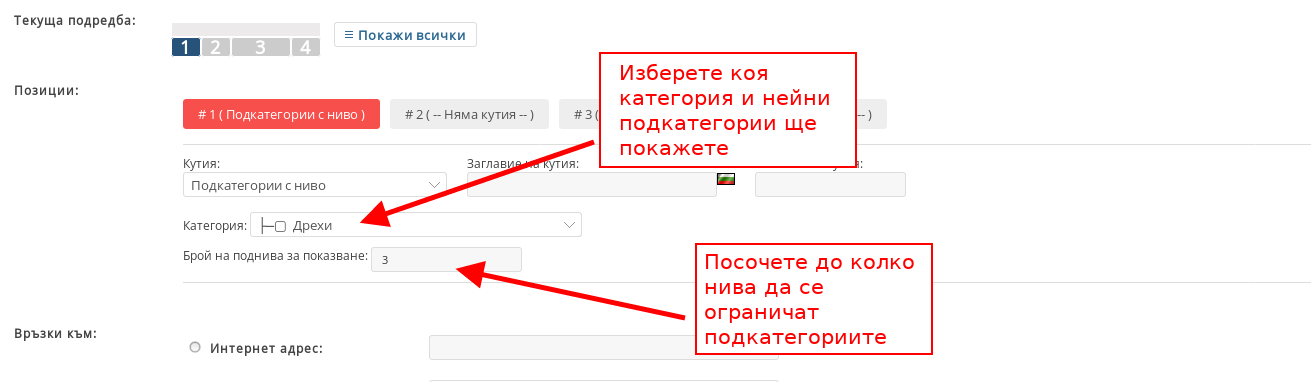 - С кутия “Подкатегории с ниво” добавяте категория, нейните подкатегории и техните нива, като можете да ограничите нивата до определена бройка чрез поле “Брой на поднива за показване”.