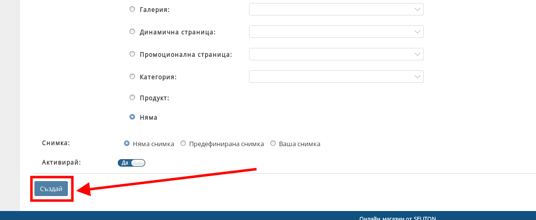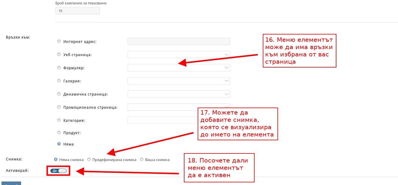 - С “Активирай” избирате дали меню елементът да е активен.