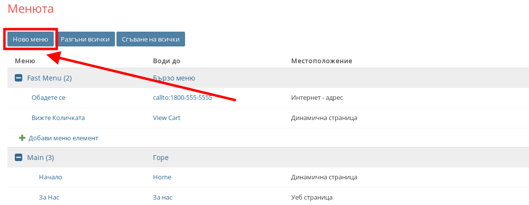 - За да създадете ново меню натиснете бутона “Ново меню”.