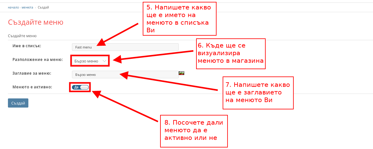 - В поле “Име в списък” задайте какво ще е името на менюта в административния панел.