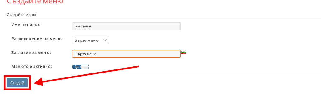 - В полето “Заглавие на меню” напишете заглавието на менюто на подходящия език.