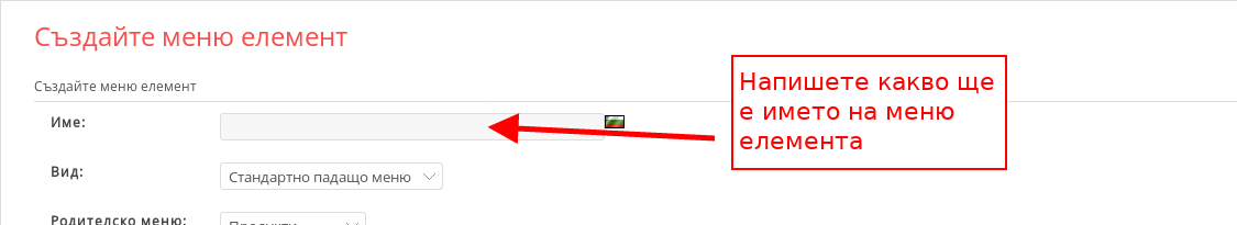 - В поле “Име” напишете какво ще е името на меню елемента, като то ще е видимо и в клиентската област.
