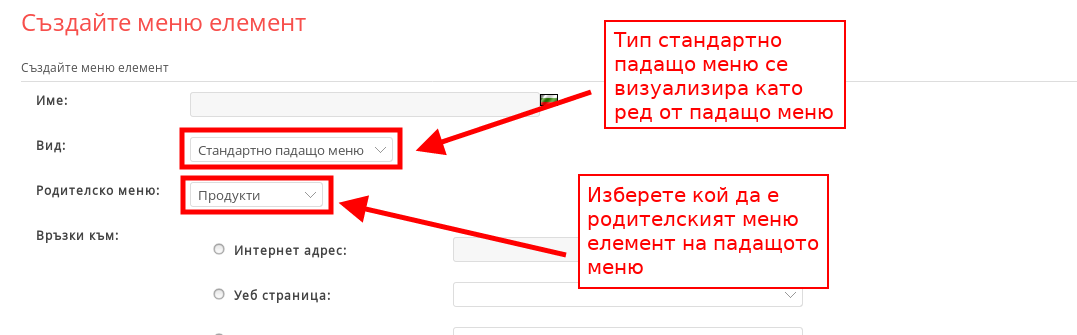 - От “Вид” избирате какъв тип меню елемент да добавите. Първият вид е “Стандартно падащо меню”: