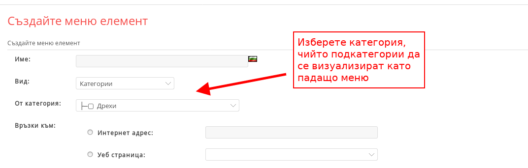 - Следващият вид е “Категории”. В него избирате категория, чийто подкатегории да се визуализират като падащо меню.