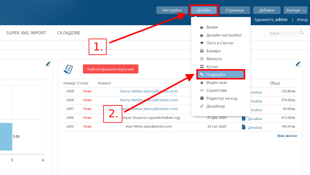 - За да отидете в подредбите на Вашия магазин, в административния си панел посочете Дизайн и натиснете върху “Подредби”.