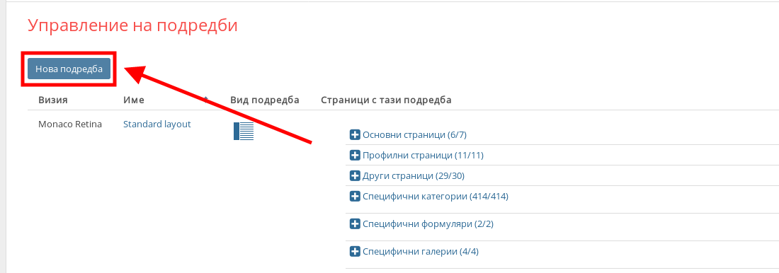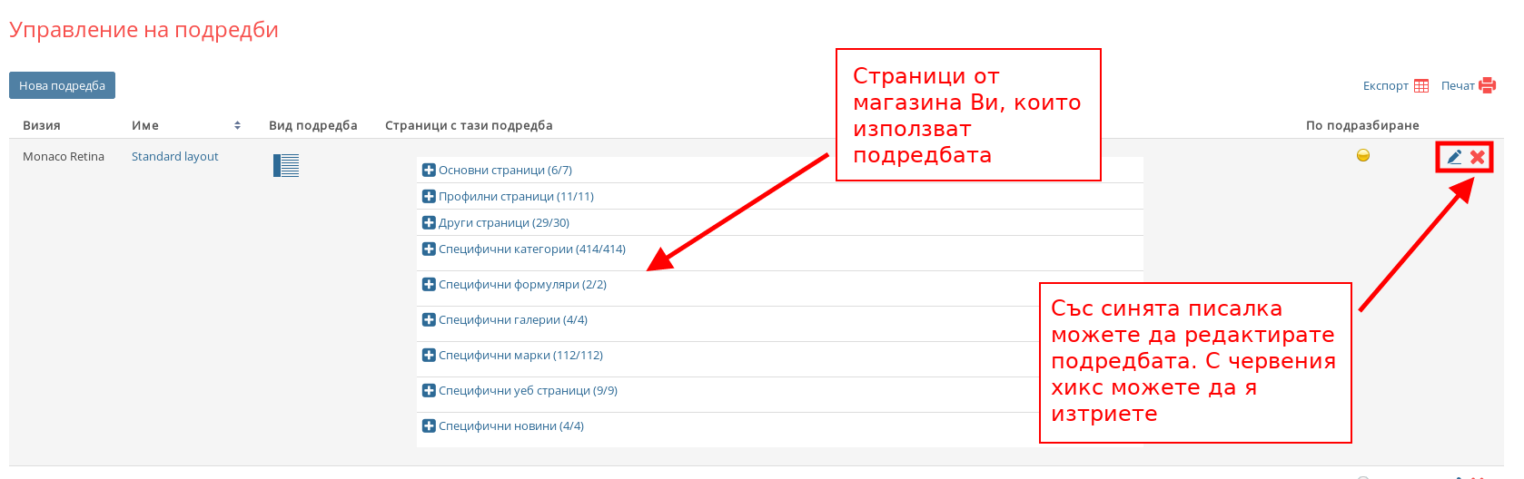 - В списъка с подредби можете да видите кои страници принадлежат на всяка подредба, както и да използвате бутоните за редакция на подредба или за изтриване.