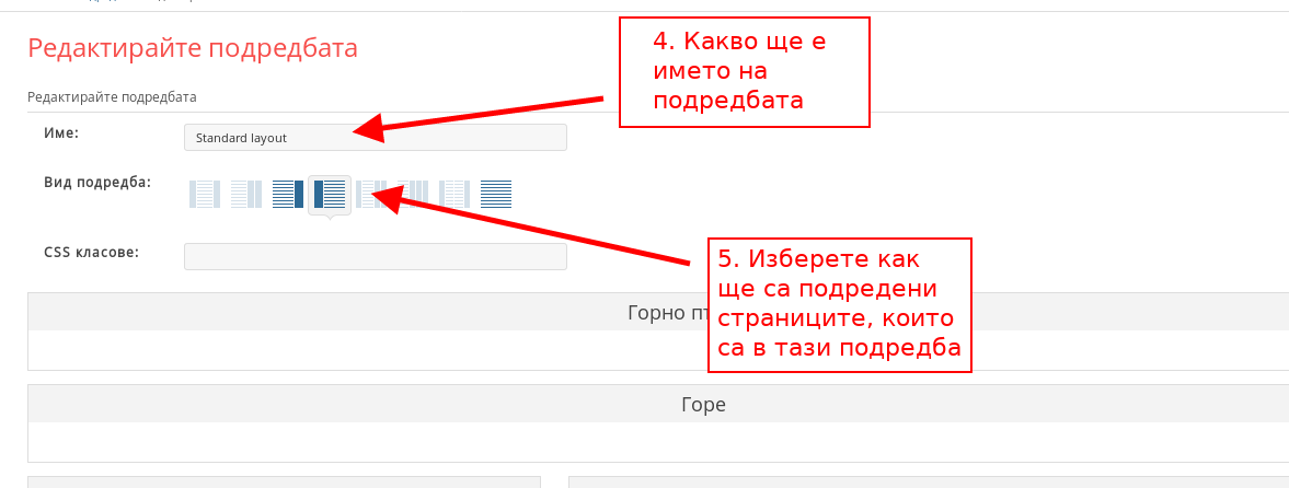 Когато създавате или влезнете в настройките за редакция на подредба можете да изберете как да е подредена страницата, както и кои кутии ще се визуализират в нея.