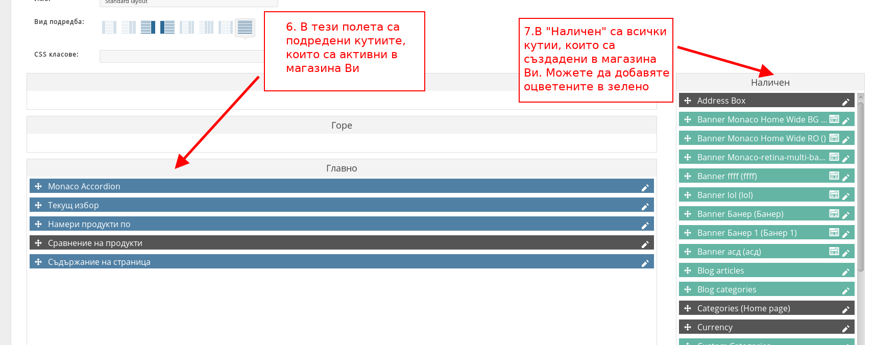 - Кутиите, които са подредени в “Горно пълзящо”, “Горе”, “Главно”, “Ляво”, “Дясно”, “Долу” и “Долно пълзящо” са тези, които са активни във Вашия магазин и ще се визуализират.