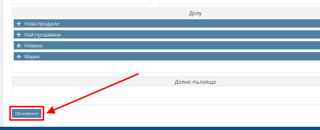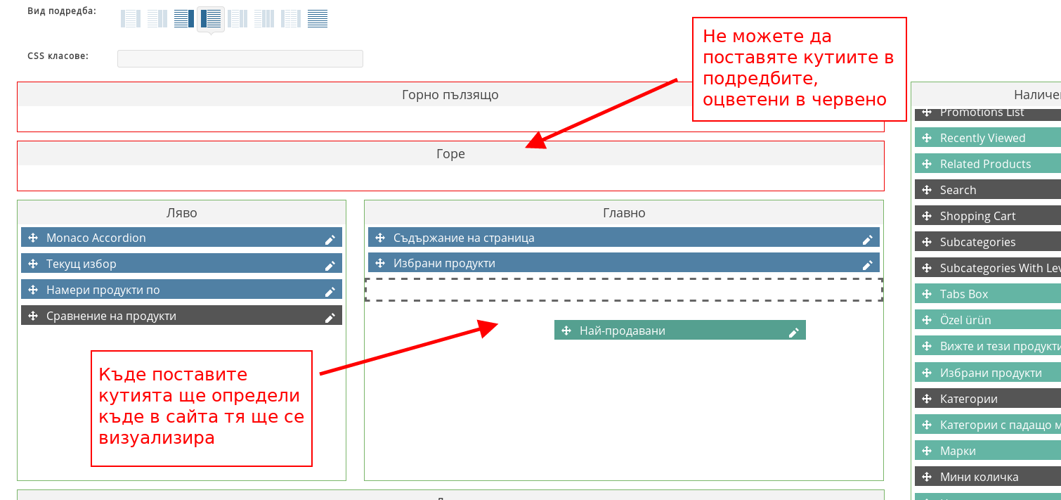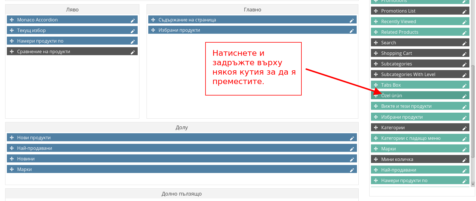- Ако искате да преместите някоя кутия за да се визуализира в магазина Ви, задръжте върху името ѝ и я преместете с мишката.