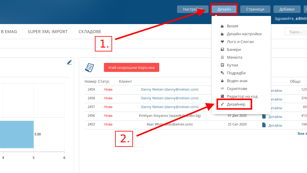 За да използвате модул “Дизайнер”, в административния си панел посочете върху Дизайн и натиснете “Дизайнер”.