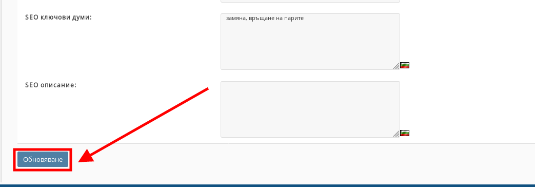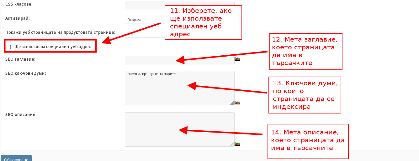 - В полето “SEO описание” посочвате какво да е мета описанието на страницата за търсачките.