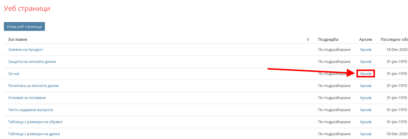- Всяка уеб страница има архив с всички нейни стари версии, които се запазват след като са направени промени. За да отидете в този архив натиснете върху “Архив”.