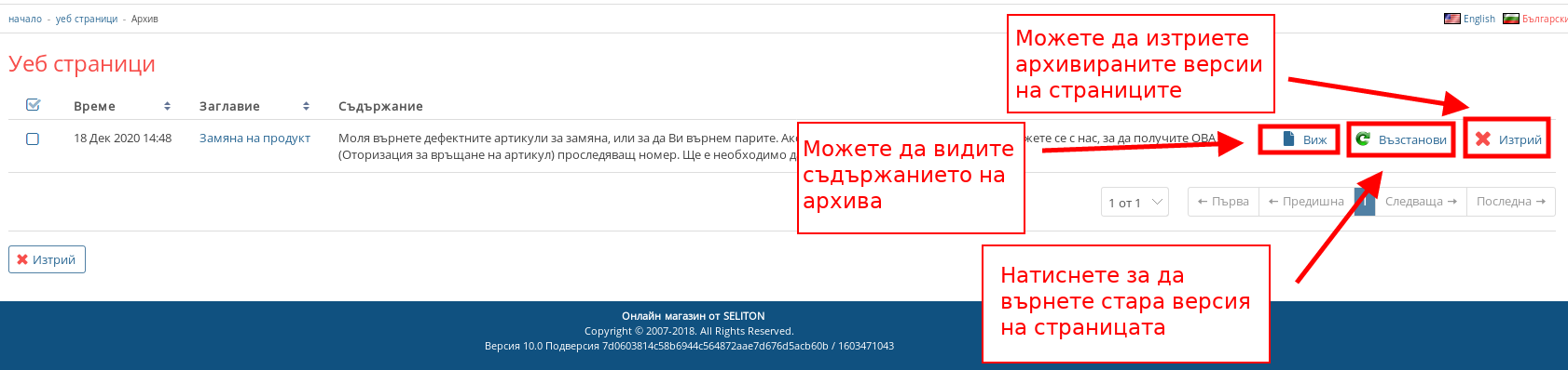 Когато влезнете в архива на страниците, можете да видите списък с всичките стари версии. Можете да преглеждате стара версия с “Виж”, да върнете страницата на старата версия с “Възстанови” и да изтриете архивната страница с “Изтрий”.