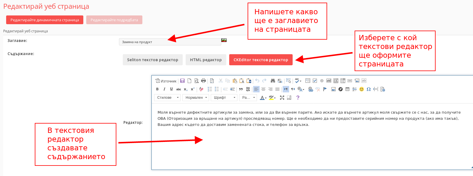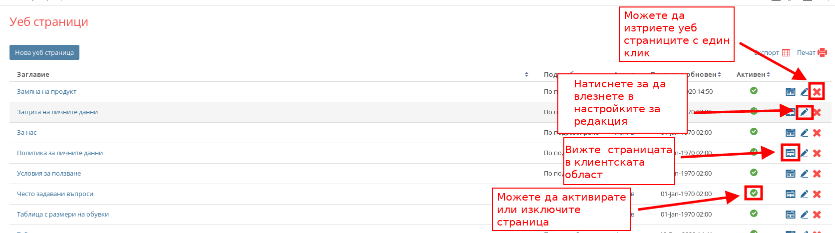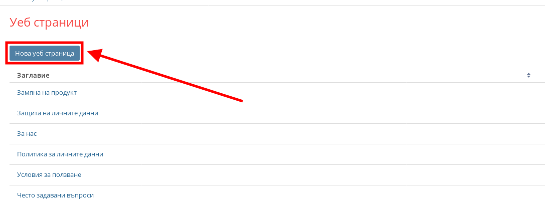 Уеб страниците във Вашия магазин се използват за да се създават страници със статично съдържание. В този вид страници можете да качвате текст, изображения, видеа, таблици и дори да се пише html код, с който да оформяте страницата.
