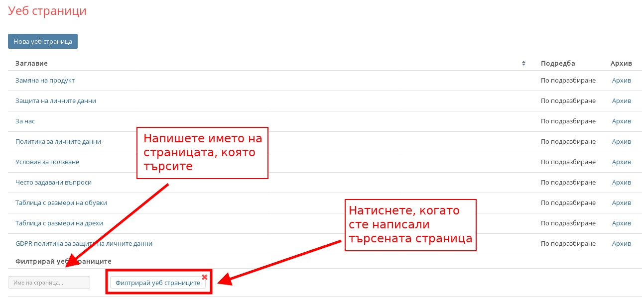 - Можете да филтрирате страниците си по име с полето в долната част на списъка. След като сте написали името на търсената страница, натиснете “Филтрирай уеб страниците”.