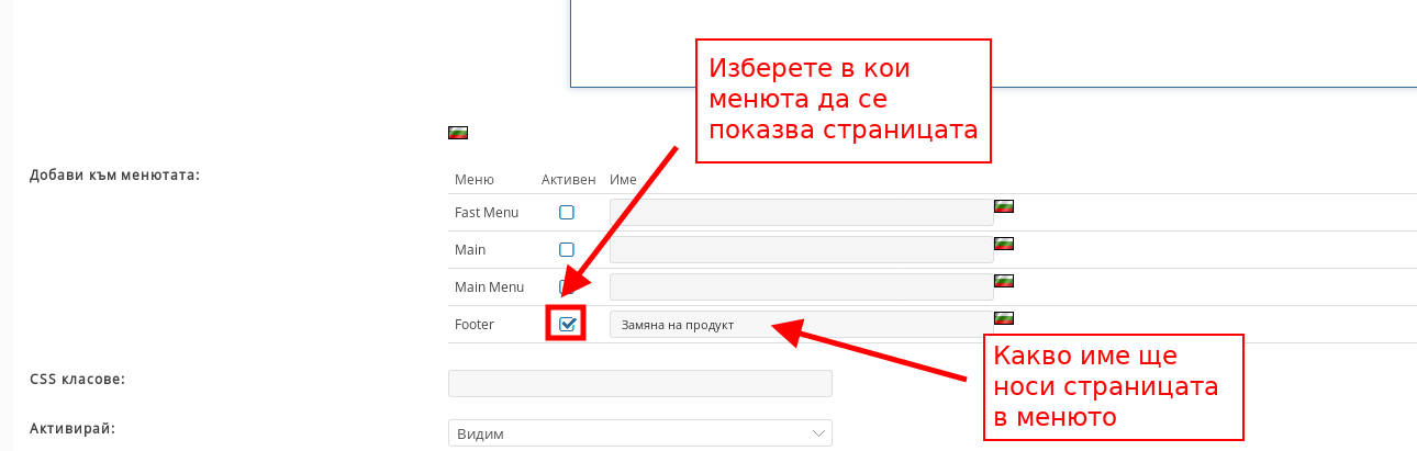 - С отметките при “Добави към менютата” избирате в кои менюта да се визуализира страницата, както и какво име да има тя в тях, като името може да е различно от заглавието на страницата.