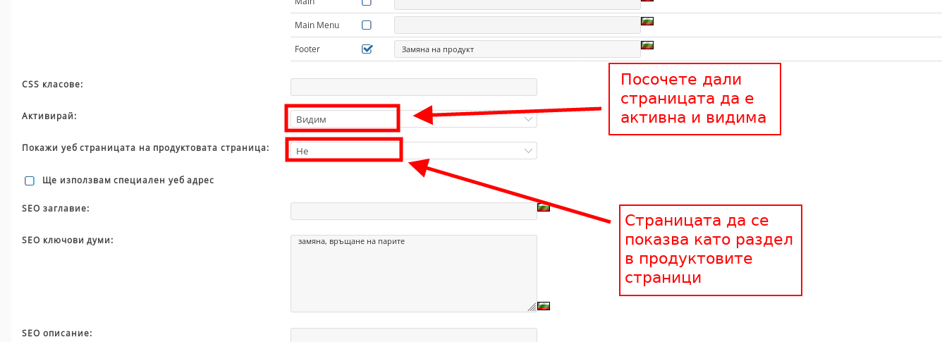 - С падащото меню “Активирай” посочвате дали страницата да е активна и да се вижда в магазина Ви.