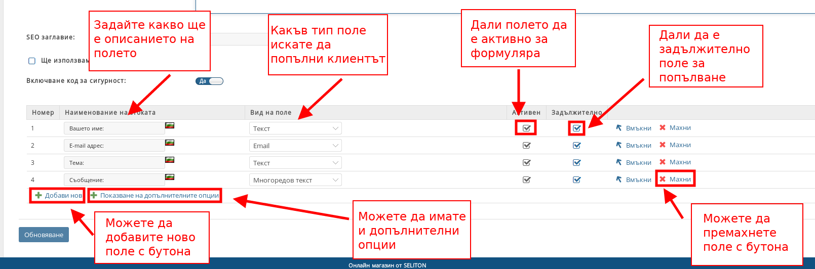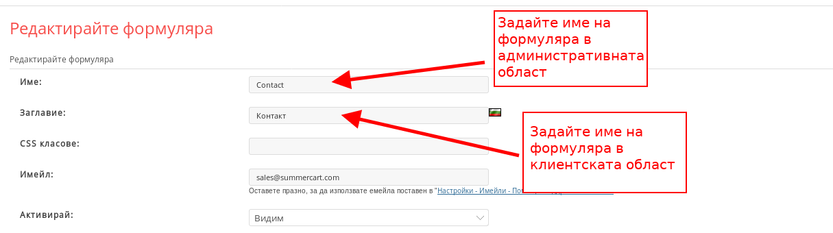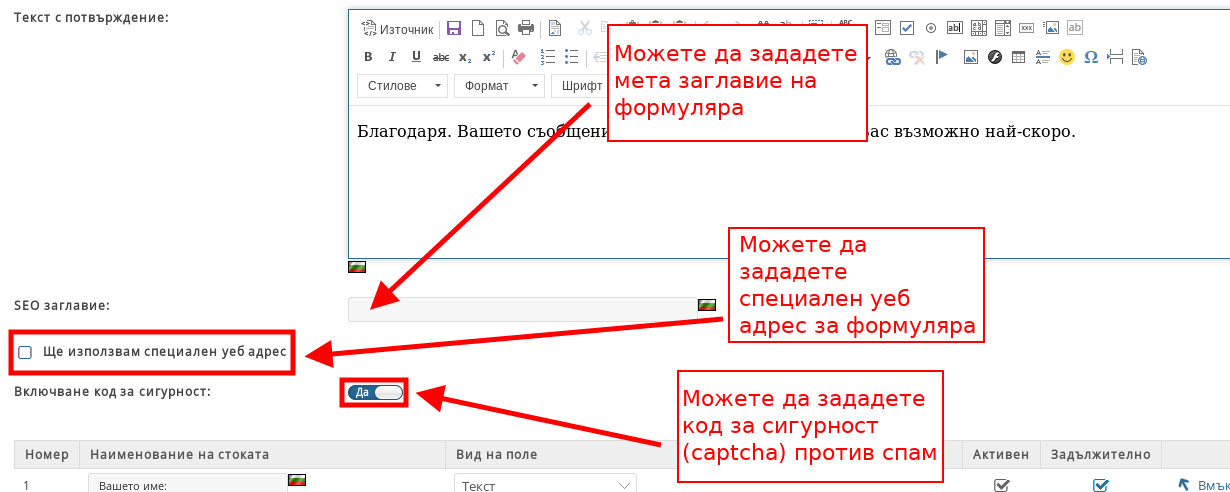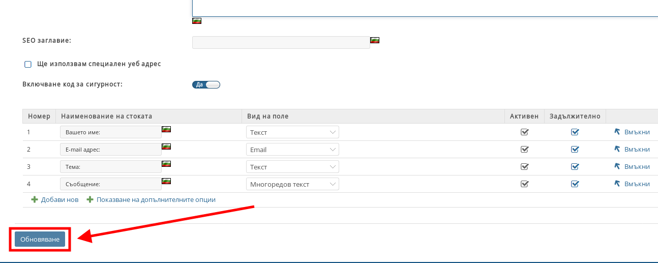 - С отметките под “Активен” избирате кои полета да са активни във формуляра;