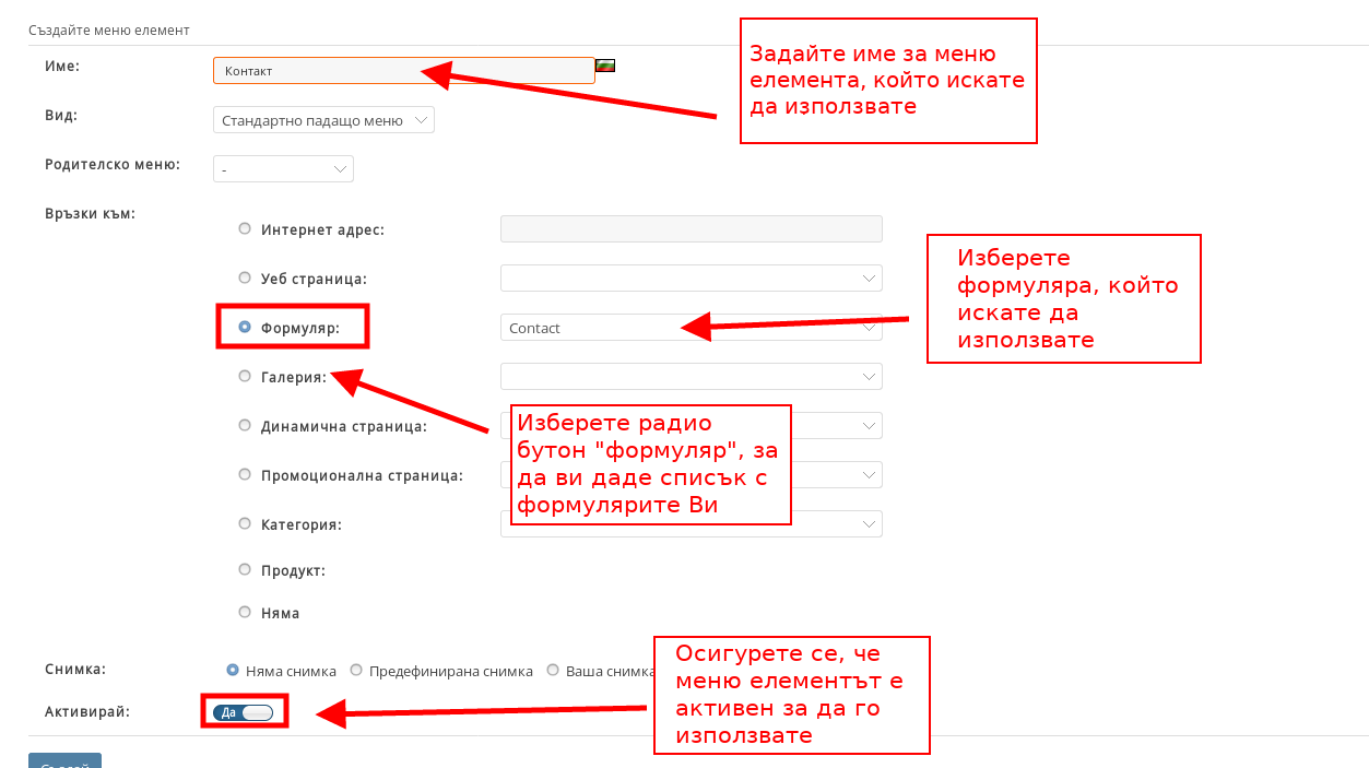- С настройката “Активен” се осигурете, че меню елементът е активен.