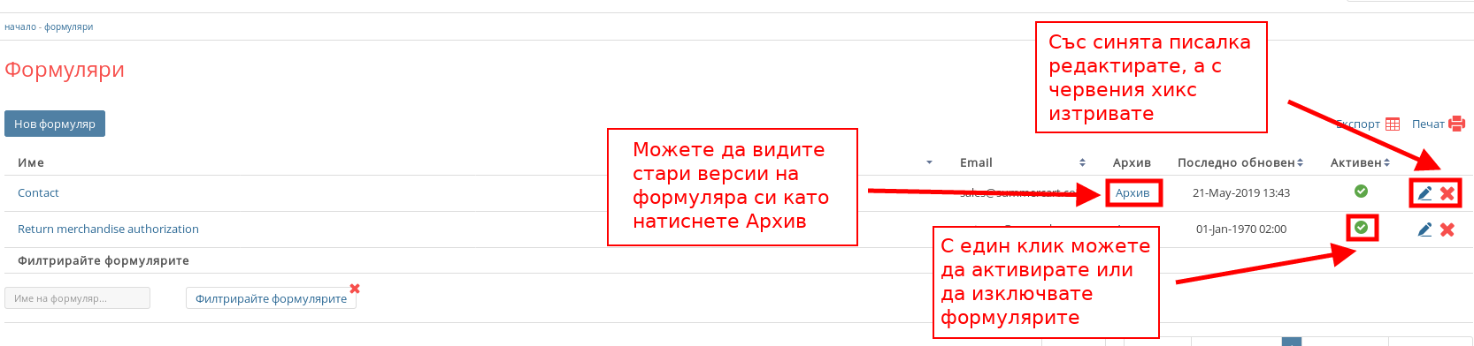 - Можете да използвате бутоните в списъка с формуляри, за да ги управлявате: