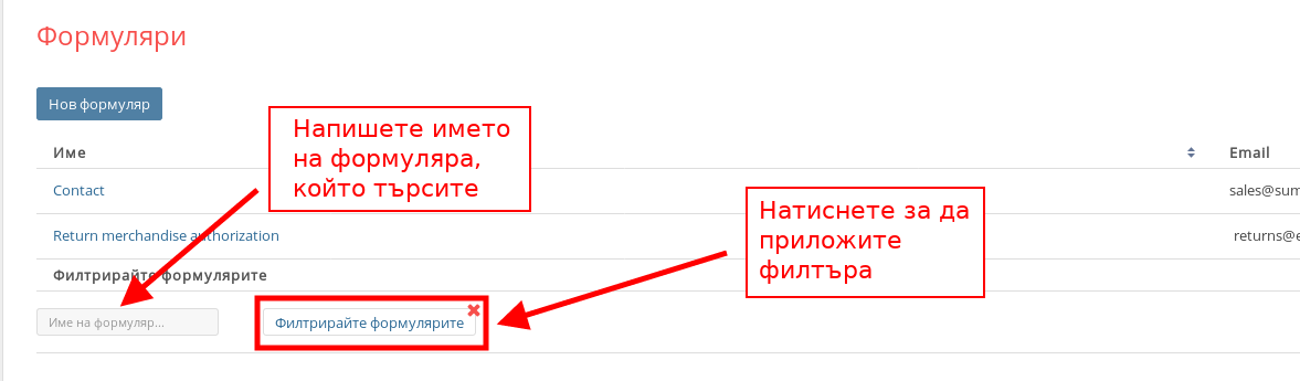 - Можете да филтрирате формулярите по име с полето в долната част на списъка. След като сте написали името на търсения формуляр, натиснете “Филтрирайте формулярите”.