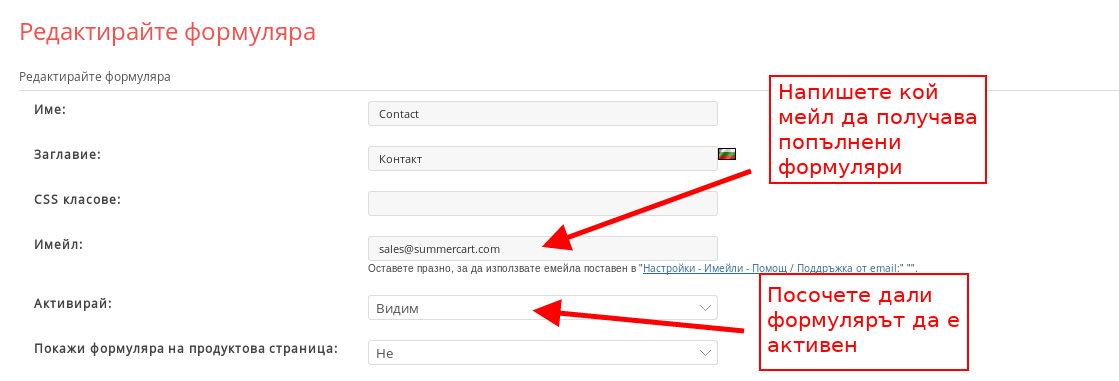 - В поле “Имейл” задайте мейл, на който да бъдат изпращани попълнените формуляри. Ако оставите полето празно ще се използва имейл адресът от настройките Ви от “E-mail-и”.