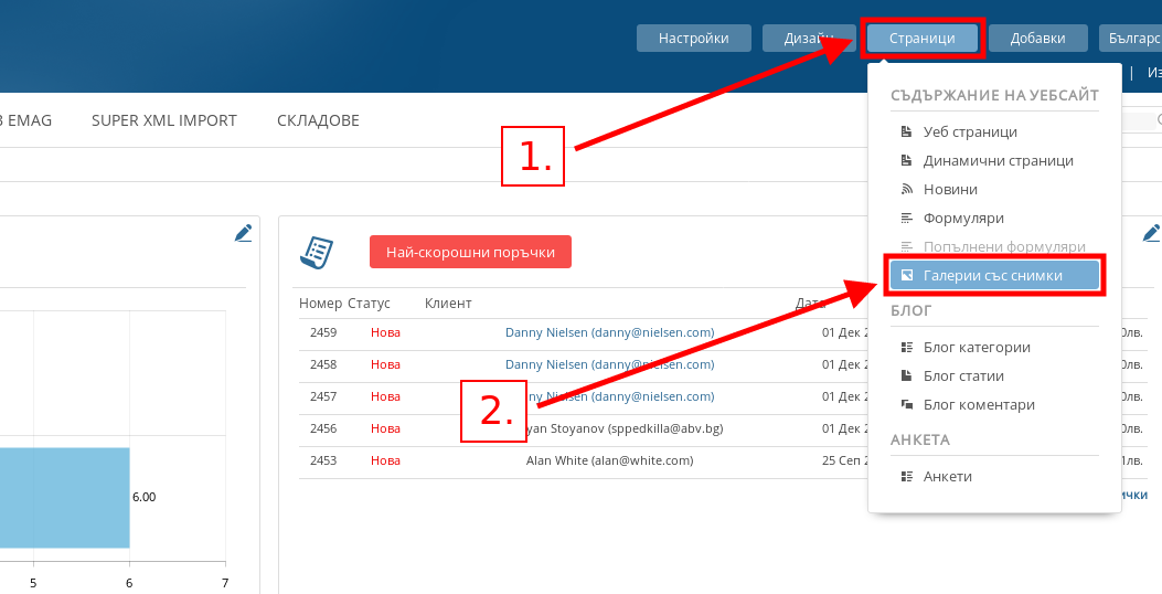 - За да създадете галерия, трябва да отидете в списъка си с галерии. В административния си панел посочете Страници и натиснете върху “Галерии със снимки”.