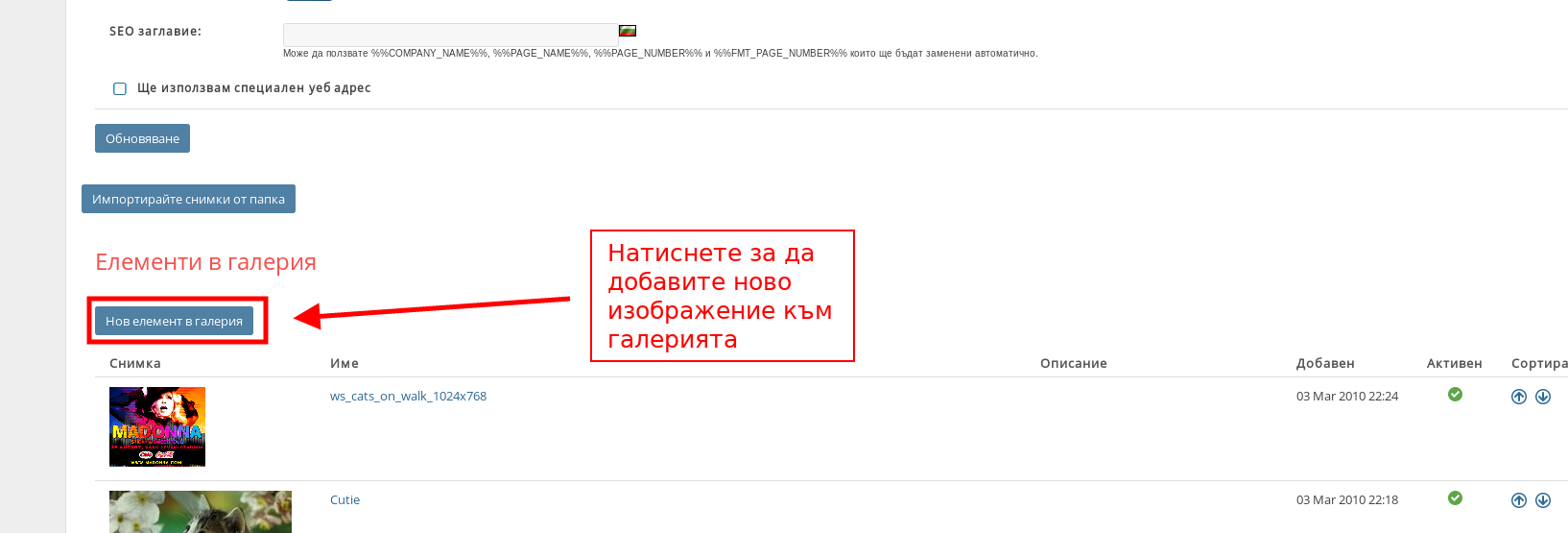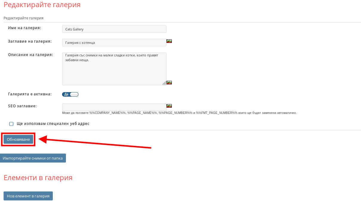 - За да добавите снимки в галерията, трябва да отидете в долната част на страницата в раздел Елементи в галерия. За да добавите снимка към галерията натиснете “Нов елемент в галерия”.