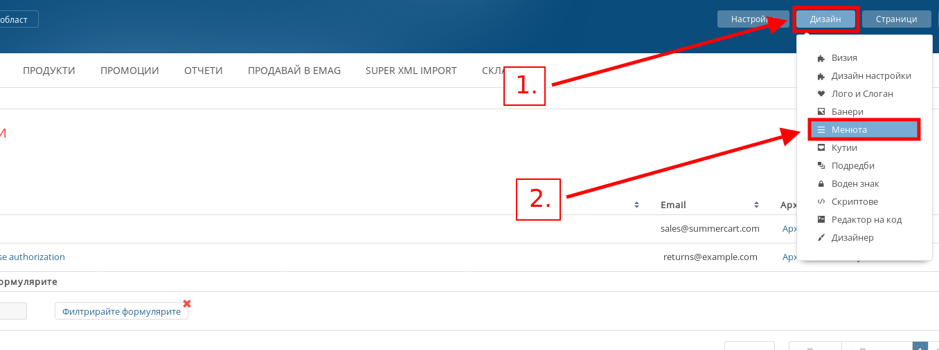- За да добавите галерията в магазина Ви, тя трябва да е част от някое меню. За да отидете в менютата си, в административния си панел посочете Дизайн и натиснете меню “Менюта”.