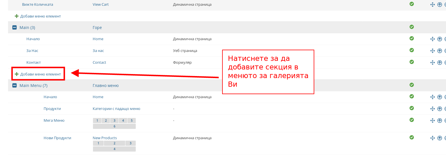 - За да добавите галерията към менюто, натиснете бутона “Добави меню елемент”. Ако искате да прочетете повече за управление на менюта, можете да го направите в нашата статия за тях.