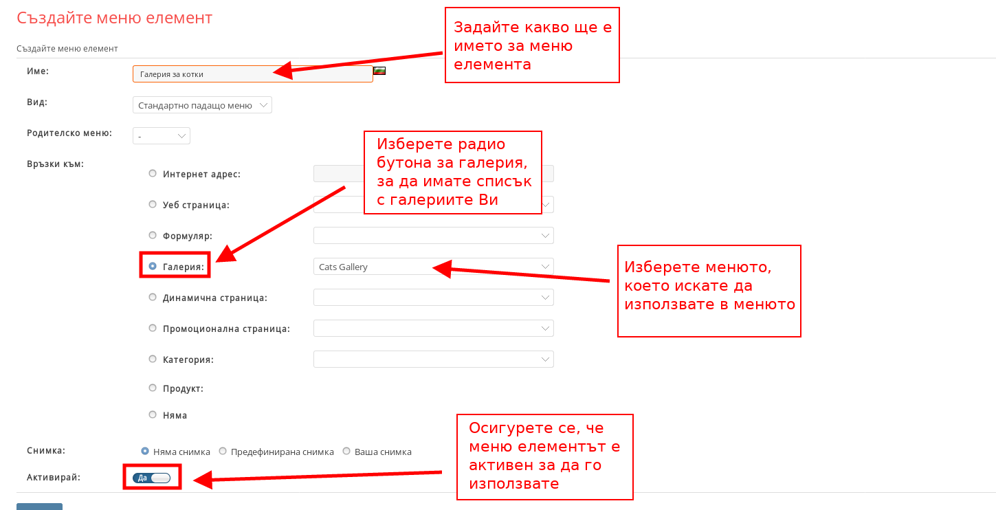 - С настройката “Галерията е активна” посочвате дали галерията да е активна в магазина Ви.