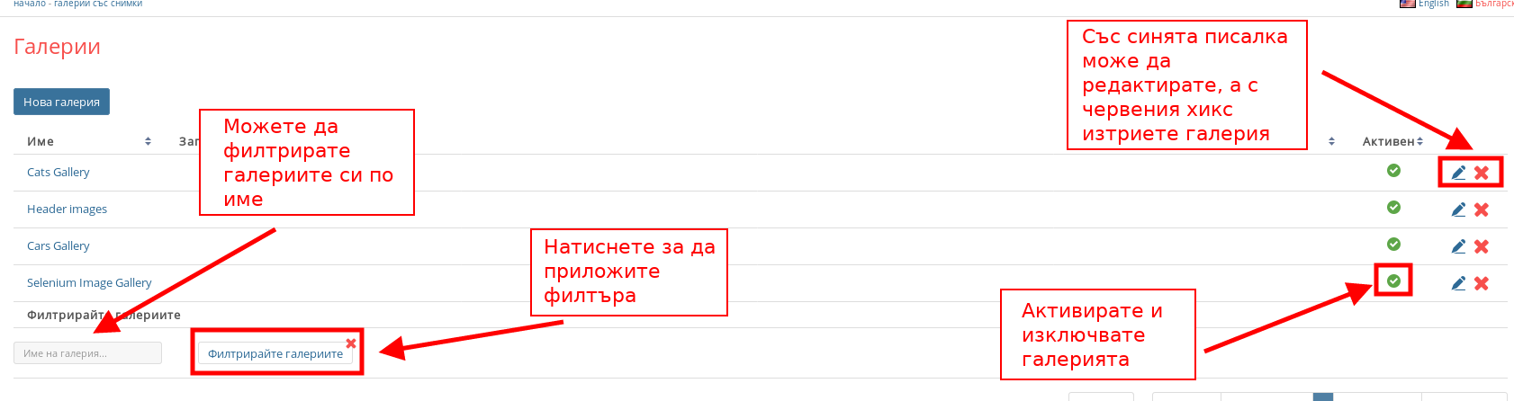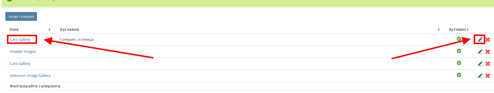 - За да редактирате галерията, в списъка натиснете върху името ѝ или върху синята писалка в дясната част на реда ѝ.