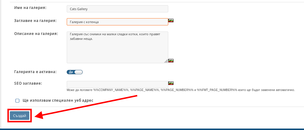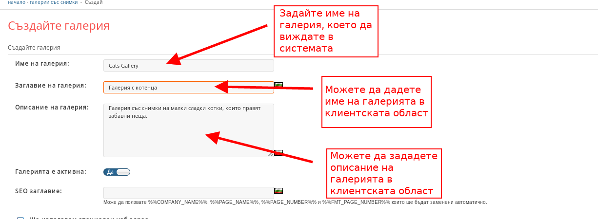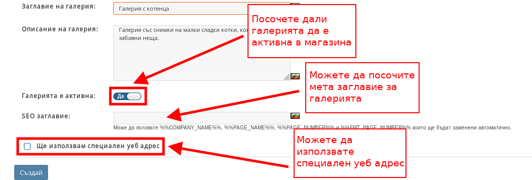 - В полето “SEO заглавие” можете да добавите мета заглавие в търсачките за галерията.