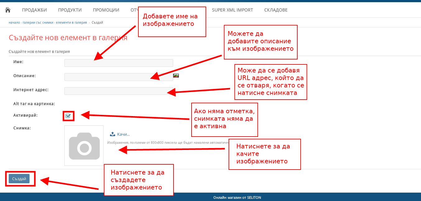 Всички Seliton онлайн магазини могат да имат галерии в магазина си. В галерията можете да качвате изображения, които клиентите да разглеждат.