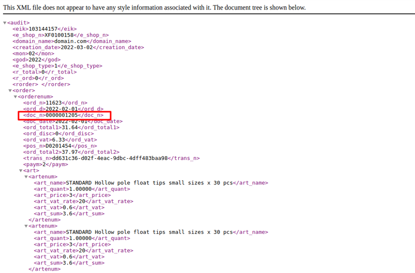 8. Генерираният файл е необходимо да го качите в сайта на НАП. Преди да го качите отворете файла с текстов редактор или с браузър и го прегледайте. Обърнете внимание в секция <doc_n> дали има генериран номер на документ за продажбата.