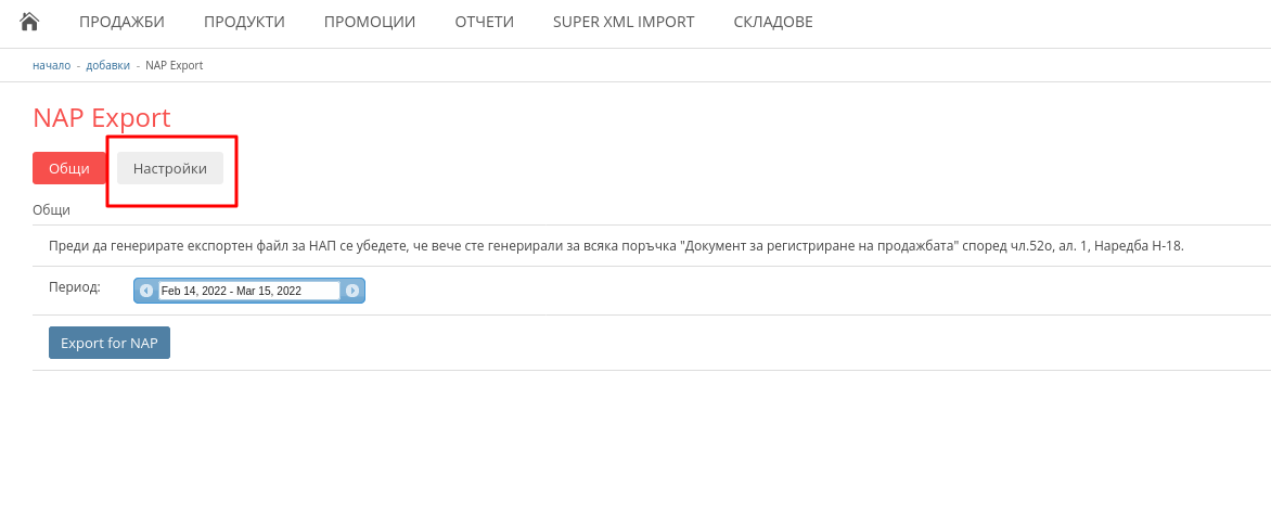 5. След като генерирате документ за регистриране на продажбата за всички поръчки, спрямо избраните филтри, отдете в главно меню "Добавки" и намерете добавката "NAP Export ". Натиснете на "Опции".