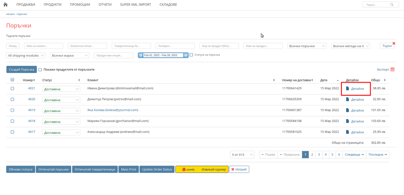3. За всички показани поръчки е необходимо да генерирате документ за регистриране на продажата. Влезте в самите поръчки като натискате на "Детайли" в края на реда.