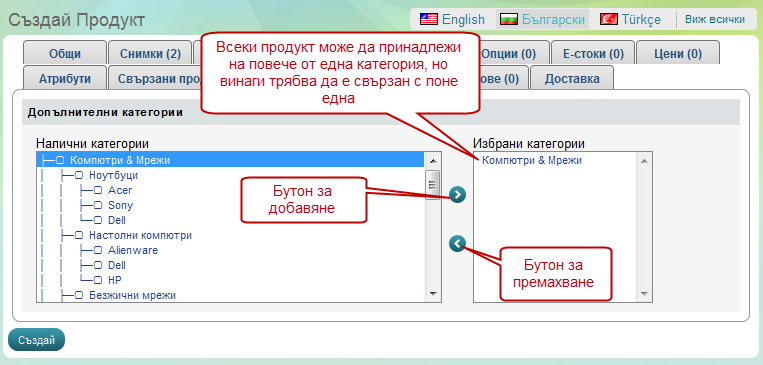Всеки продукт може да бъде добавен в повече от една категория и това става точно от този раздел.