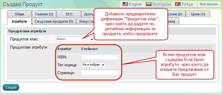 В раздел „Общи“ видяхте как изглеждат атрибутите, но те могат много повече от това, като се свържат в продуктов клас. В този раздел може да добавите продуктов клас към продукта Ви, с помоща, на който да дадете допълнителна информация относно продукта Ви. (линкове към продуктови класове и към атрибути).