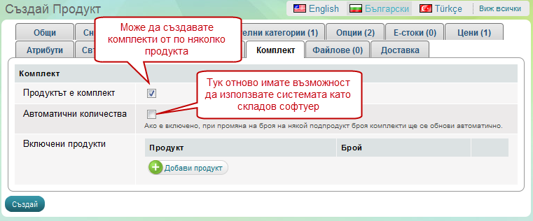Като тук отново имате възможността, да използвате системата като складов софтуер, който да следи и наличностите от Вашите продукти. Във всеки продукт може да включите неограничен брой продукти, като всичко става от бутона „Добави продукт“ и след това маркирате продуктите, които желаете да се комплектоват с Вашия.