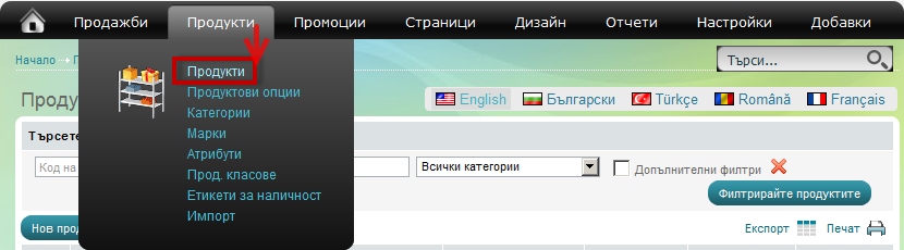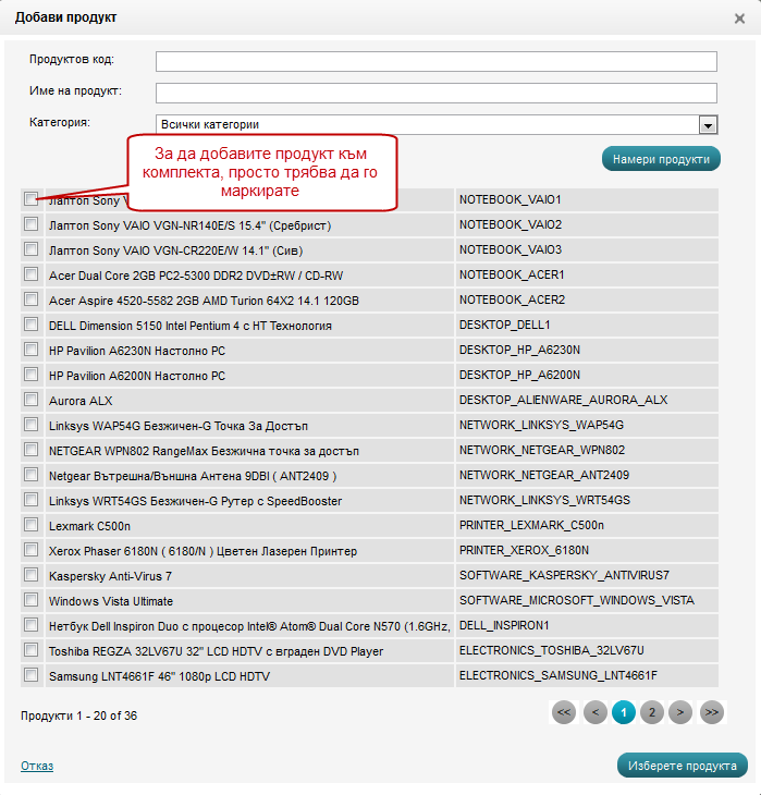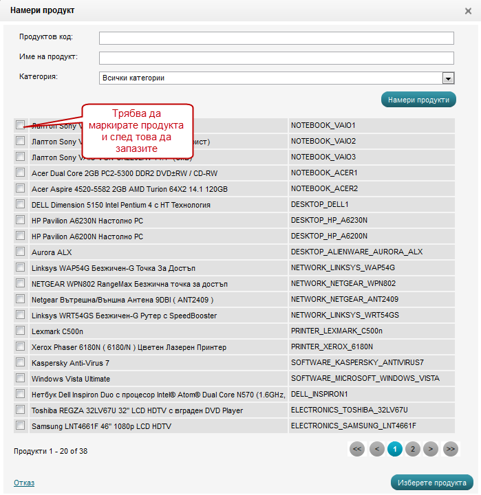 Добавянето на продукт става от бутона „Добави продукт“ след това от отворилият се прозорец трябва да маркирате, които продукти да бъдат добавени.