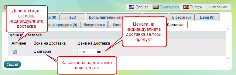 От този раздел може да изберете индивидуална доставка за всеки един продукт. Така клиента ако поръчка този продукт, ще трябва да плати отделна доставка за него (линк към пер-продукт доставка). Като това може да стане за всяка зона за доставка.