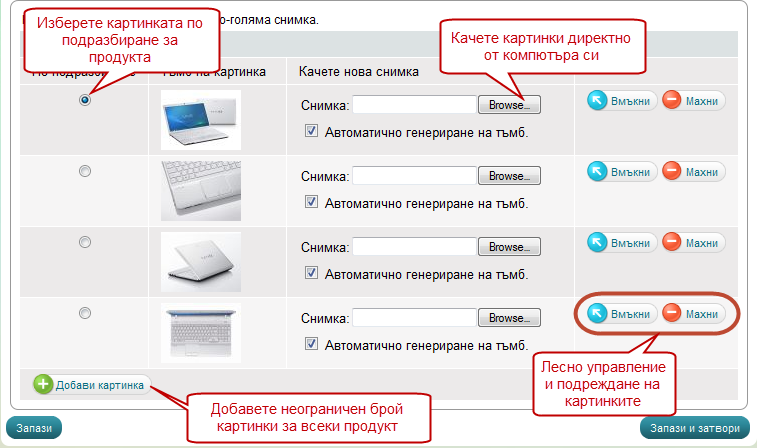 За всеки един продукт може да добавите неограничен брой картинки по приятен за Вас начин, а те автоматично ще се оразмерят с размерите зададени от Вас в настройките на магазина.