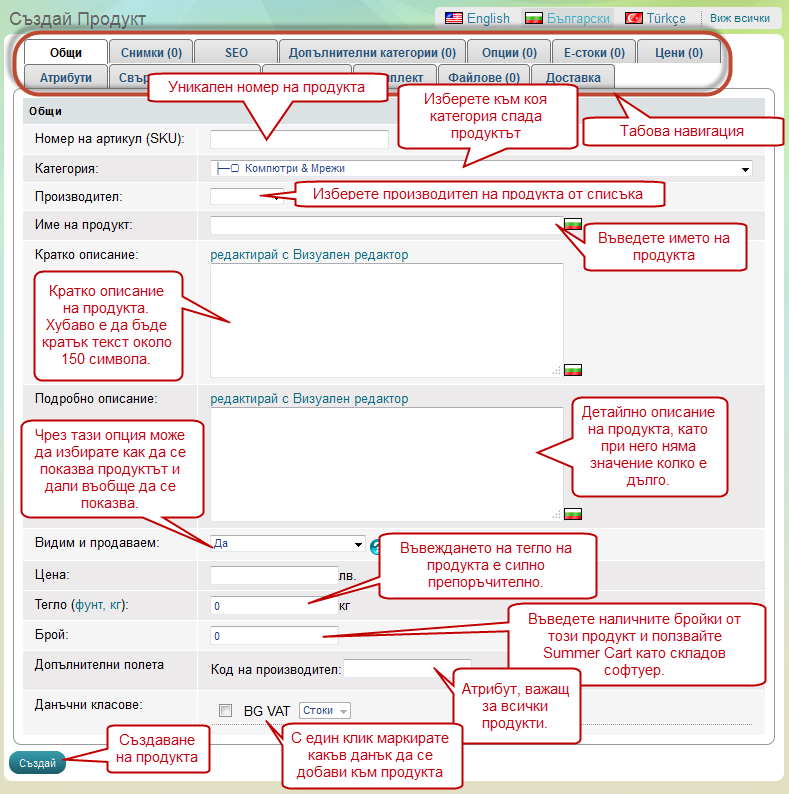 SKU: Това поле трябва да бъде уникално за всеки един продукт. В Summer Cart то играе ролята на каталожен номер.