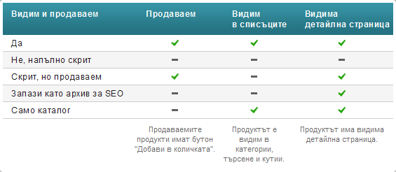 Видим и продаваем: С тази функция Summer Cart Ви дава възможност да показвате, скривате продукти или просто да ги оставите под формата на каталог. В таблицата има повече информация.