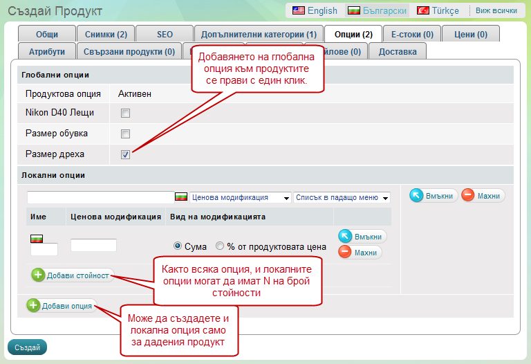 Тук може да добавите глобална опция към продукта, който създавате или да създадете локална опция само за този продукт.