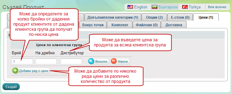 С помоща на този раздел, може да задавате различни цени за всяка клиентска група. Като цените могат да бъдат за различни бройки от продукта или пък на 1, 5, 10, 100 бройки от продукта цената да се променя за всяка клиентска група.