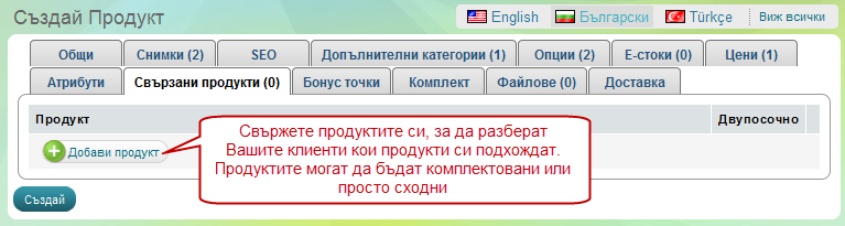 Може да добавяте N на брой продукти, които да бъдат свързани с даденият продукт, като това може да бъде двупосочно или не. Двупосочно ще рече, че в добавените продукти също ще се показва този продукт, който създавате / редактирате в момента.