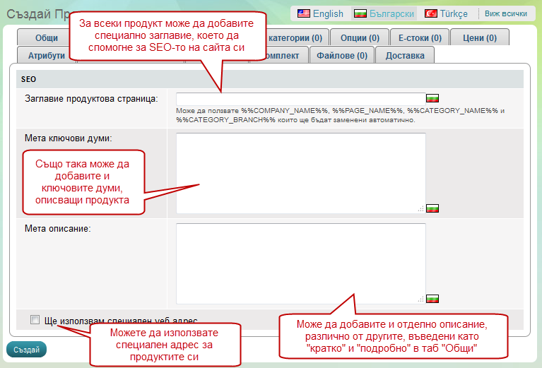 Заглавие продуктова страница: Може да използвате същото име, като това, което сте въвели за продукта, а също така и динамичните променливи: %%COMPANY_NAME%%, %%PAGE_NAME%%, %%CATEGORY_NAME%% и %%CATEGORY_BRANCH%%.